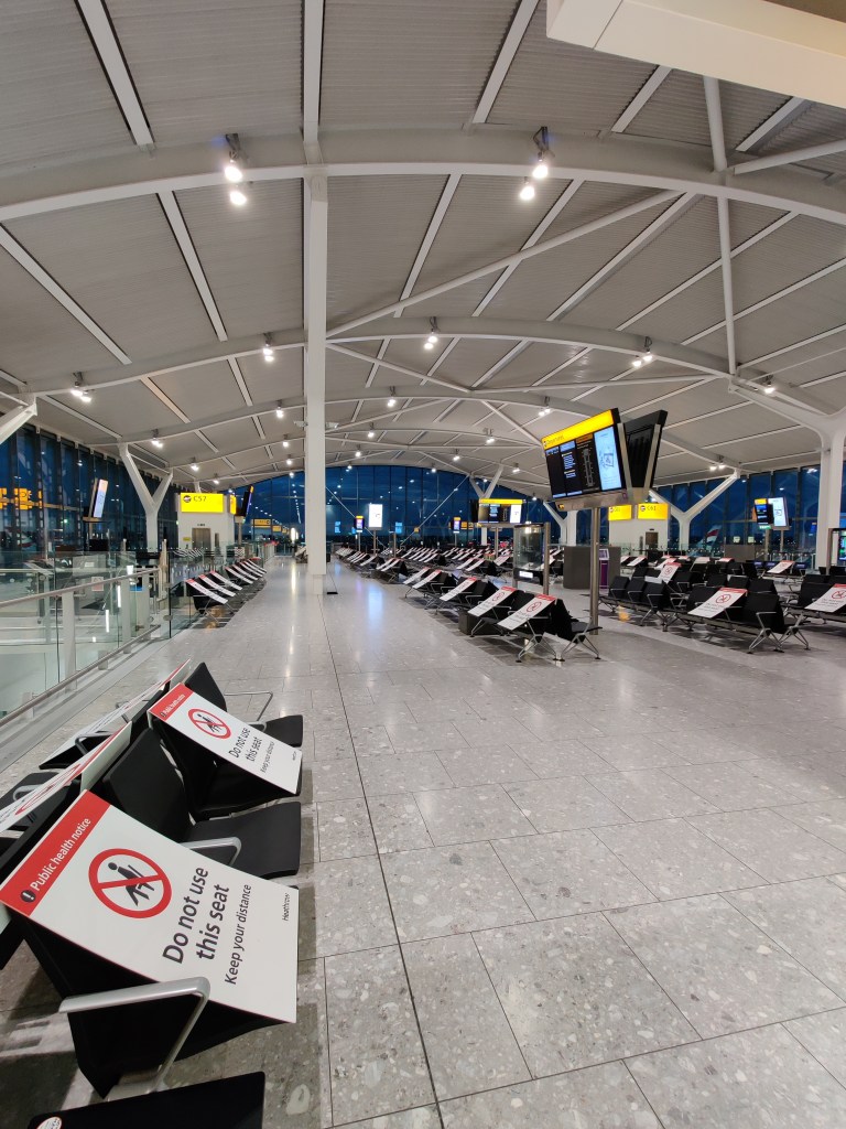 A single traveler sitting in front of me, at an otherwise completely empty departure hall. Every 10 minutes, speaker reminds us of unattended luggages, which will be destroyed if found. A handful of planes are scattered outside, but compared to what it usually is, it’s really empty there, too.